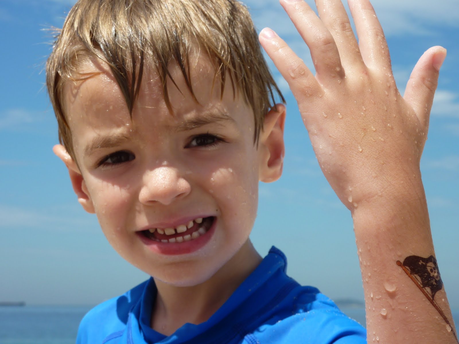 Here are some more of Luke's pirate tattoos. You can see the pistol on his bicep here - Jason taught him to ask people, "You wanna see my guns?" and then flex!